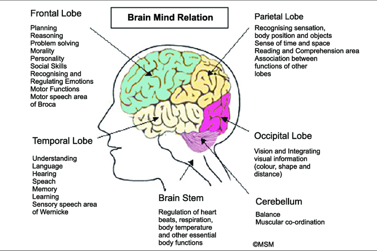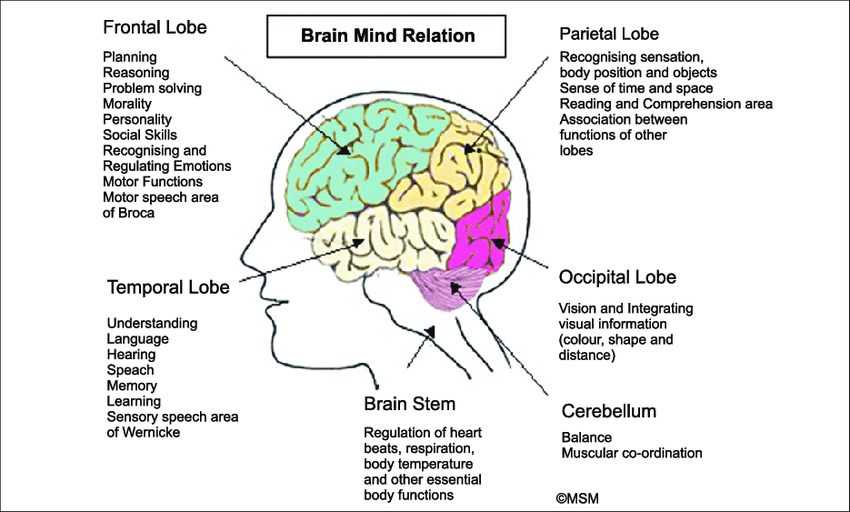 Prefrontal Cortex: Located at the front of the brain, this region is responsible for executive functions such as decision-making, problem-solving, planning, and impulse control. It's crucial in regulating emotions and behavior.